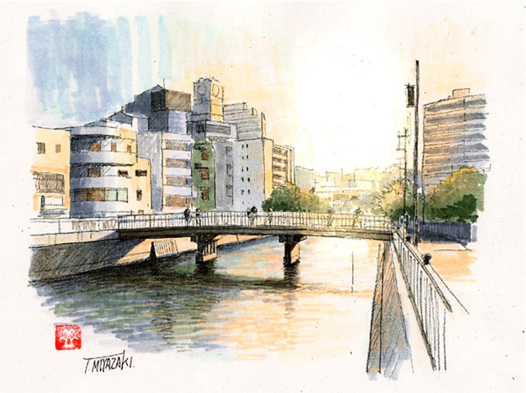旧東海道保土ヶ谷宿の帷子橋夕景 最近この河はタマちゃんの出現で有名になった 着彩:鉛筆画にカラーマーカー